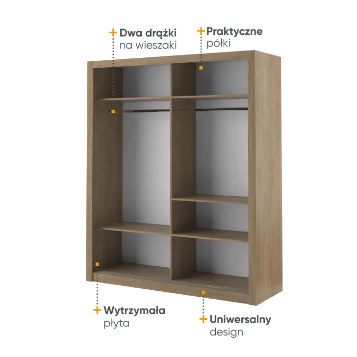 Wewnątrz szafy znajduje się praktyczny drążek na ubrania i kilka pojemnych półek, które na pewno ułatwią przechowywanie Twoich rzeczy. Dodatkowym atutem są otwory montażowe, umożliwiające bezpieczne przymocowanie szafy do ściany. Takie rozwiązanie zwiększa stabilność mebla, a jednocześnie minimalizuje ryzyko przewrócenia.
