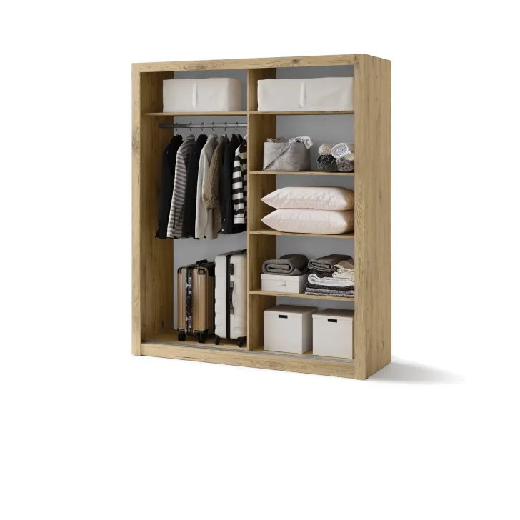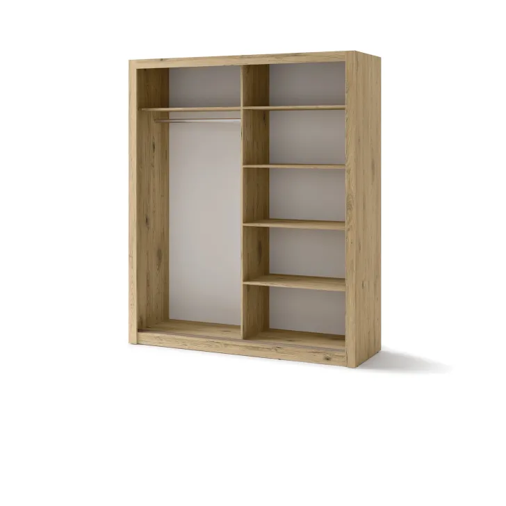 Szczególnie wyróżniającym się elementem w szafie JADIA 3 są jej dwuskrzydłowe drzwi przesuwne z lustrem. Dzięki takiemu rozwiązaniu, zarówno wnętrze szafy jak i całe pomieszczenie optycznie powiększa się, a Ty zyskujesz pełen komfort podczas korzystania z niej. Niewątpliwą zaletą jest także jej wyposażenie, które obejmuje drążek na wieszaki i obszerne półki, umożliwiając łatwe i przejrzyste uporządkowanie wszystkich przechowywanych rzeczy.