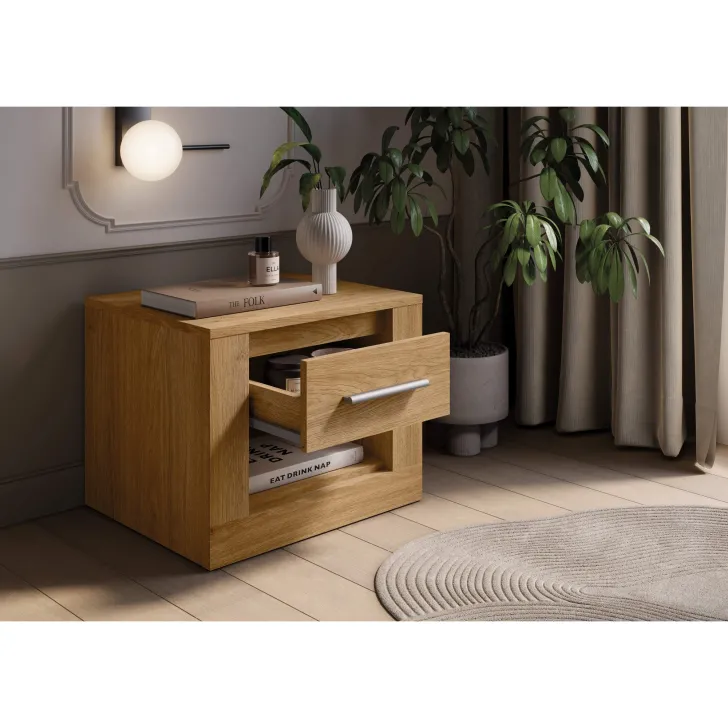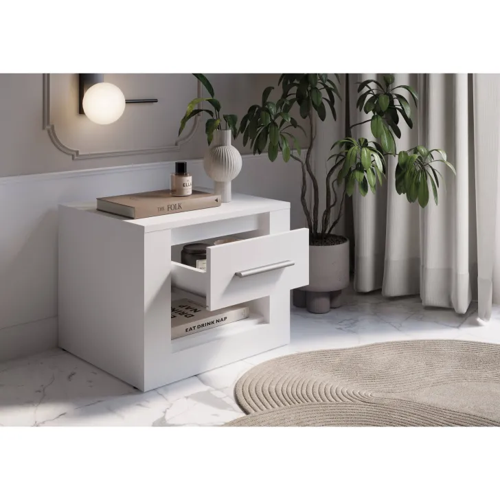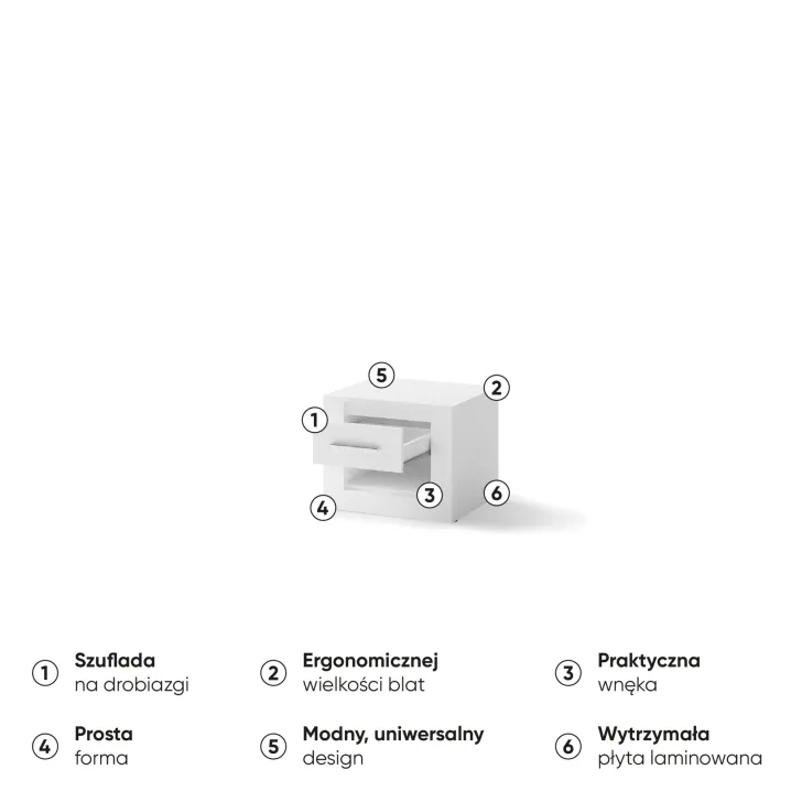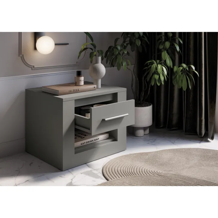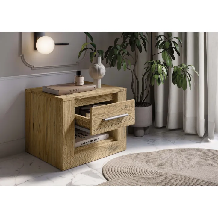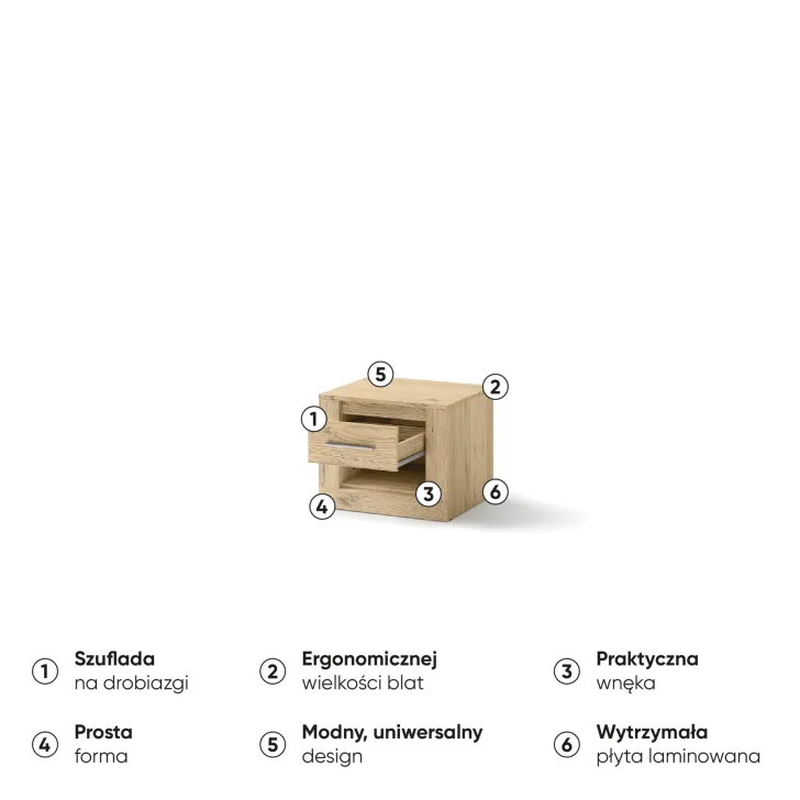 Podkreśl elegancję Twojej sypialni, dodając do niej szafkę nocną JADIA 7. Zadbaj o komfort i funkcjonalność swojego wnętrza, nie rezygnując przy tym z estetyki. Ta szafka nocna to znakomity wybór dla tych, którzy szukają połączenia praktyczności i modnego designu.