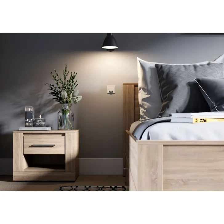 Zastanawiasz się, jak skutecznie zaaranżować przestrzeń wokół swojego łóżka? Idealnym rozwiązaniem może być nasza szafka nocna JADIA 7. Wyjątkowo praktyczna, doskonale wpisuje się jako mebel pomocniczy w każdej sypialni, niezależnie od stylu i metrażu. Blat szafki jest na tyle duży, że bez problemu zmieścisz na nim lampkę do czytania, ulubione kwiaty lub ramki ze zdjęciami. Dodatkowo, w zależności od indywidualnych preferencji, szafka dostępna jest aż w czterech wariantach kolorystycznych: biały, szary, dąb shetland i dąb sanremo.