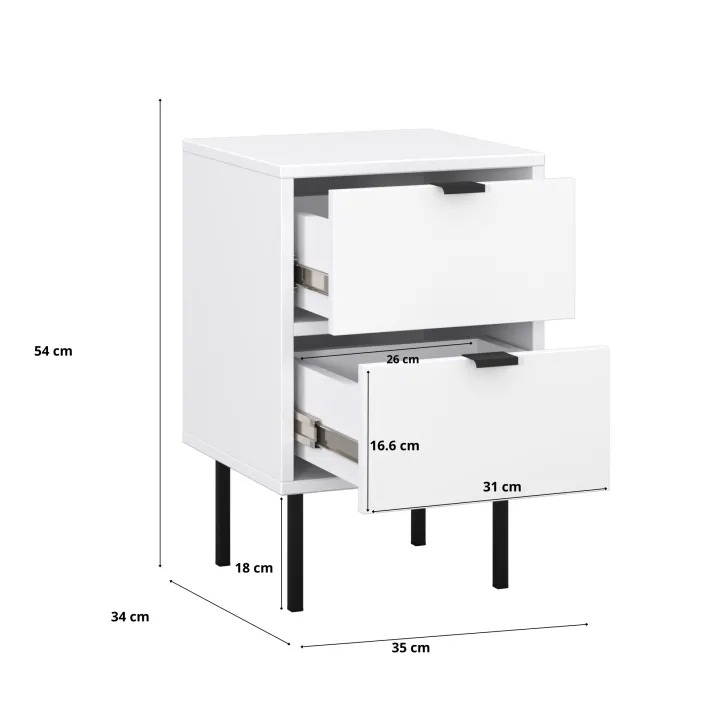 Wymiary Szafka nocna "KOIDO", dwie szuflady, czarne elementy, biały kolor:
