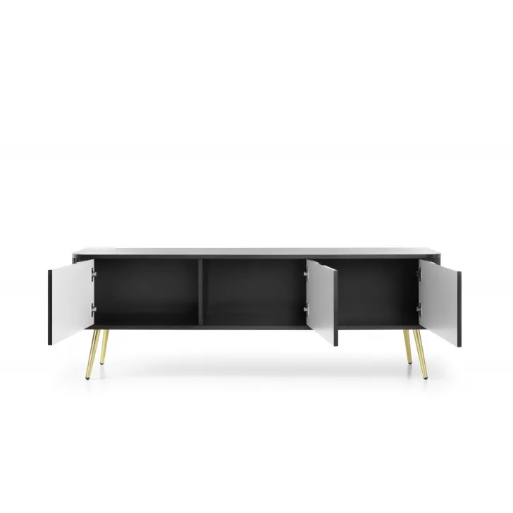 Nie tylko piękna, ale także praktyczna. Szafka RTV ZOYA posiada pojemne wnętrze, przedzielone na trzy części, które skrywają się za solidnymi drzwiami z płyty MDF. To pozwala na łatwy dostęp do przechowywanych przedmiotów i sprzętu RTV.