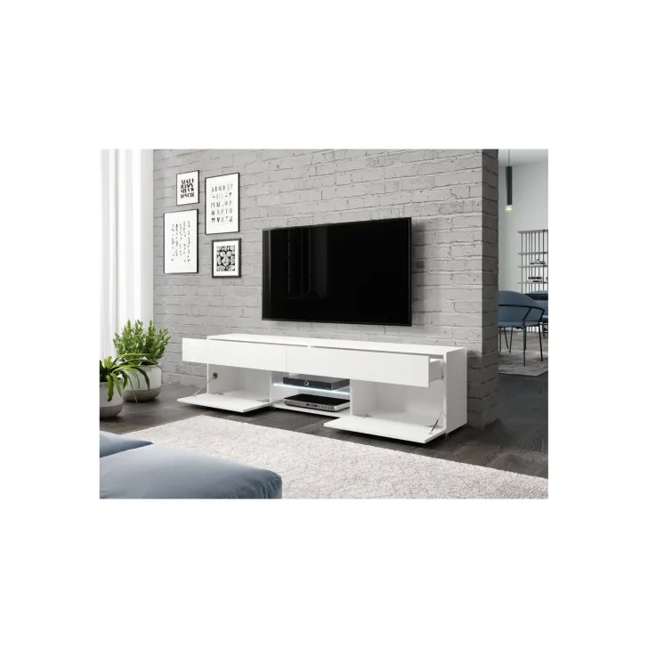 Szafka RTV CARE jest nowoczesnym meblem, którego design doskonale odnajdzie się w każdym wnętrzu. Wykonana w białym, połyskującym kolorze stanowi piękną bazę dla telewizora, podkreślając jego obecność, nie przysłaniając go jednocześnie. Model o szerokości 180 cm to rozwiązanie, które zaspokoi nawet najbardziej wymagające oczekiwania. Szafka RTV CARE łączy w sobie prostotę formy z praktycznymi rozwiązaniami.