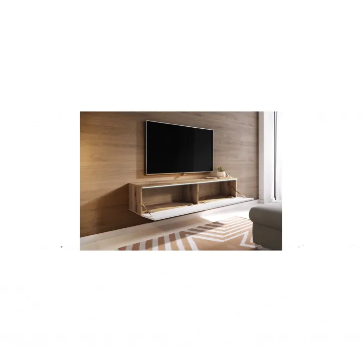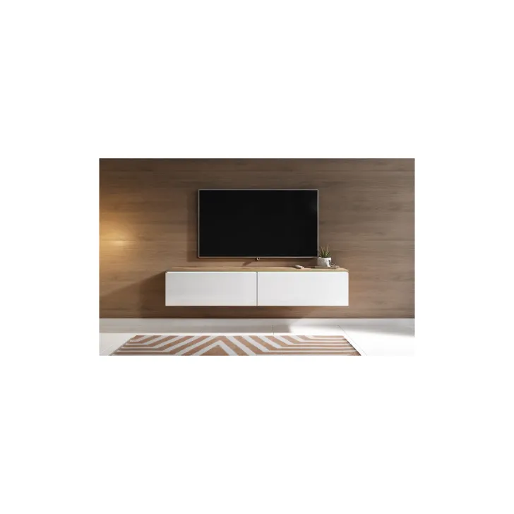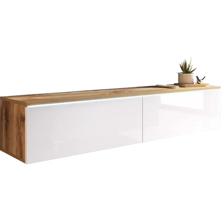 Prezentujemy Państwu szafkę pod telewizor o wymiarach 140 cm, w eleganckiej kolorystyce dąb Wotan / biały połysk - mebel stającą na skrzyżowaniu funkcjonalności, nowoczesności i stylu. Ta unikalna szafka RTV, o wysokiej jakości wykonania, może zostać zawieszona na ścianie lub ustawiona na srebrnych nogach, co czyni ją idealnym dopełnieniem do aranżacji zarówno małych jak i dużych pomieszczeń.