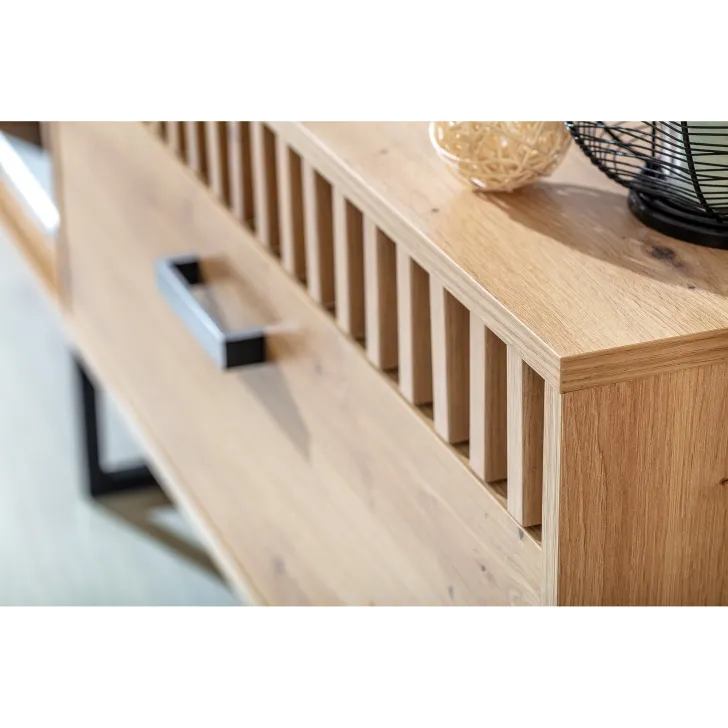 Design mebla to sprytna kombinacja czarnych, metalowych nóżek i uchwytów z tylną ścianką utrzymaną w tym samym kolorze. Wszystko to pięknie kontrastuje z kolorystyką dąb artisan, tworząc efektowny i prosty design loftowy.