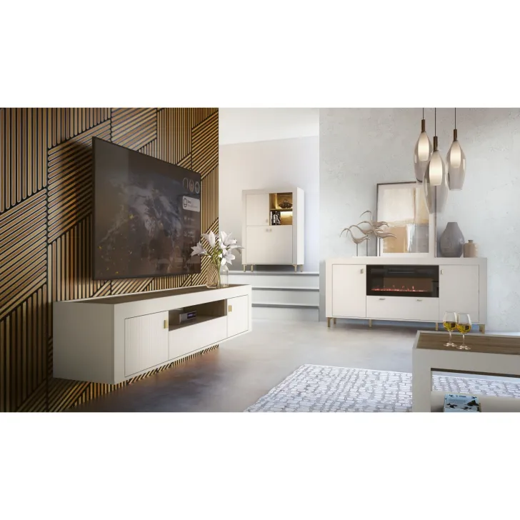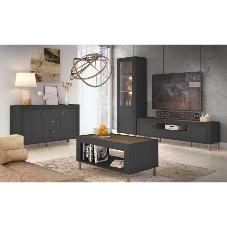 Przestronna szuflada oznacza, że nigdy więcej nie będziesz musiał szukać pilota lub twoich ulubionych DVD. Subtelne ozdobne elementy, wnętrze i wieko w kolorze drewna łączą się ze stonowanymi kolorami (czerń, biel lub kaszmir) tworząc harmonijną i uspokajająca atmosferę.