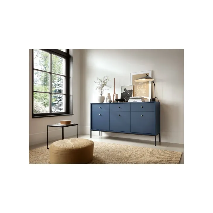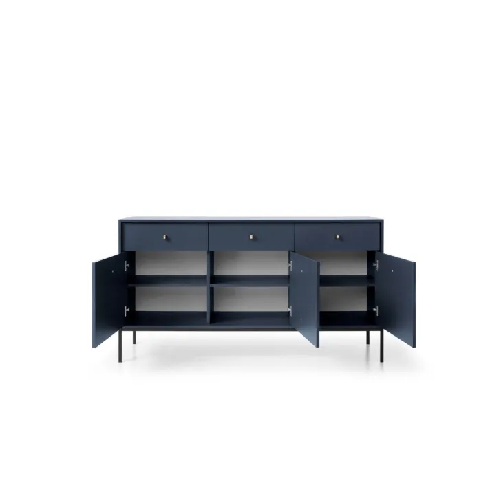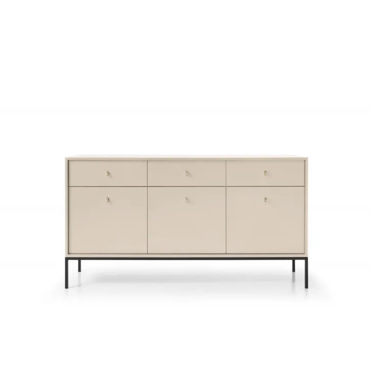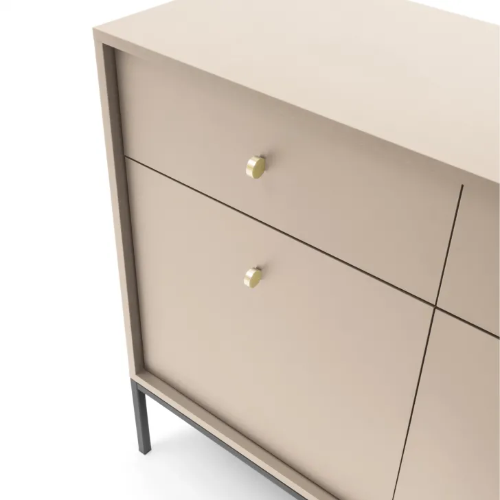 Szafkę cechuje ponadczasowe, minimalistyczne wzornictwo. Kolor komody, dostępny zarówno w tonacji niebieskiej jak i beżowej, tworzy ciekawe połączenie z ozdobnymi uchwytami, dodając wnętrzu elegancji. Wysokie, stabilne nogi z metalu dodają meblowi lekkości i nowoczesności.