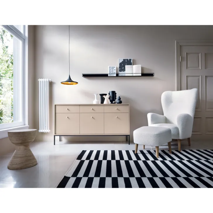 Komoda "MINIMAL" oferuje trzy pojemne szuflady, które idealnie sprawdzą się do przechowywania mniejszych przedmiotów, podczas gdy zakryte drzwiami półki umożliwiają ukrycie większych elementów. Dzięki temu, wszystko co potrzebujesz, zawsze będzie pod ręką, a jednocześnie niewidoczne dla gości.