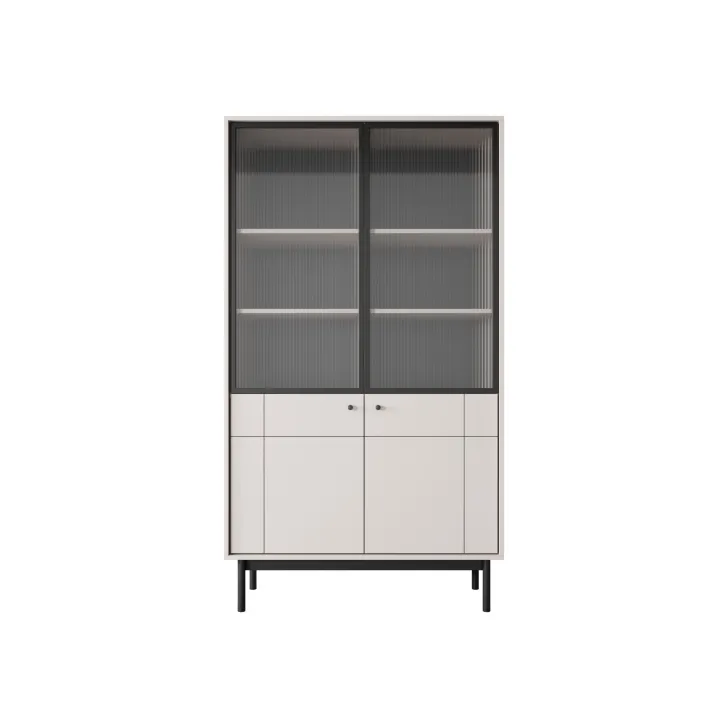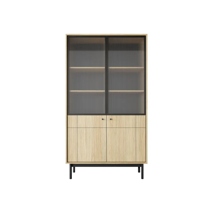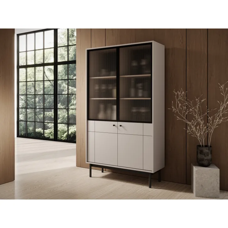 Interesującą cechą witryny JUKON są przeszklone fronty. Umożliwiają one elegancką ekspozycję porcelany, szkła czy chociażby kolekcji książek. Równocześnie, pełne fronty witryny ukrywają za sobą praktyczne półki, które pozwolą na uporządkowane przechowywanie różnorodnych przedmiotów.