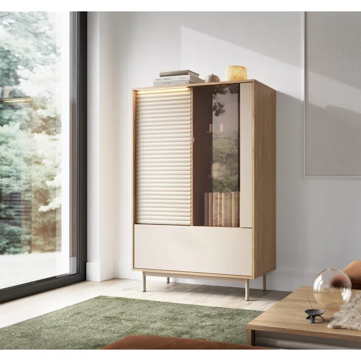 Witryna LITA 1 cechuje się inteligentnym podziałem na trzy strefy przechowywania. Część przeszklona z szklanymi półkami idealnie nadaje się do ekspozycji ozdobnych przedmiotów, a pełny front z efektownym ryflowaniem kryje miejsce na rzeczy, które chcemy przechować z dala od wzroku. W dolnej części witryny znajduje się szafka, z dwoma schowkami.