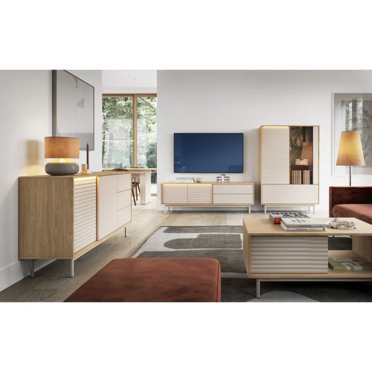Wyróżniającym elementem Witryny LITA 1 jest połączenie nowoczesnej estetyki z ponadczasową elegancją. Kolorystyka kaszmiru i olejowanego dębu w parze z ryflowanymi frontami oraz metalowymi, wysokimi nóżkami, tworzy harmonijną całość. Dodatkowe oświetlenie LED uwydatnia frezowany wzór 3D na froncie z MDF-u, nadając meblom wyjątkowego charakteru.