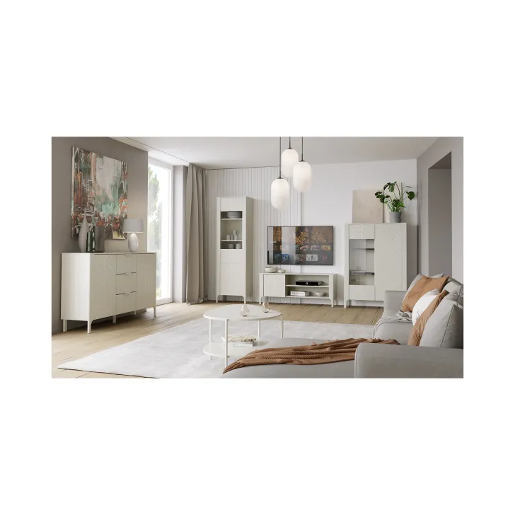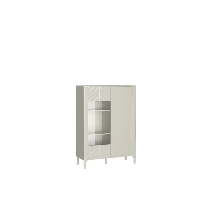 Witryną wykonano z wysokiej jakości płyty laminowanej, a jej unikalne fronty zdobi wzór jodełki. Czy możesz sobie wyobrazić, jak taki efekt wizualny doda Twojemu wnętrzu przytulności? W połączeniu z dostępnymi kolorami: czarnym Painflow i kaszmirem, ten mebel naprawdę przyciągnie wzrok.