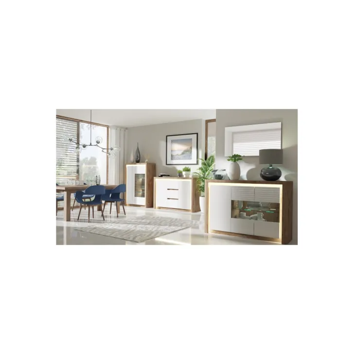 Witryna niska LIVIO jest wykonana z trwałej płyty laminowanej, która gwarantuje trwałość i odporność na codzienne zużycie. Białe fronty tańczą w rytmie połysku, błyszcząc na tle koloru dębu ribbeck. Drzwi szafy wykonane są z płyty laminowanej, co zapewnia solidność i trwałość, a ich krawędzie pokryte są specjalnym obrzeżem ABS, które zapewnia dodatkową ochronę.