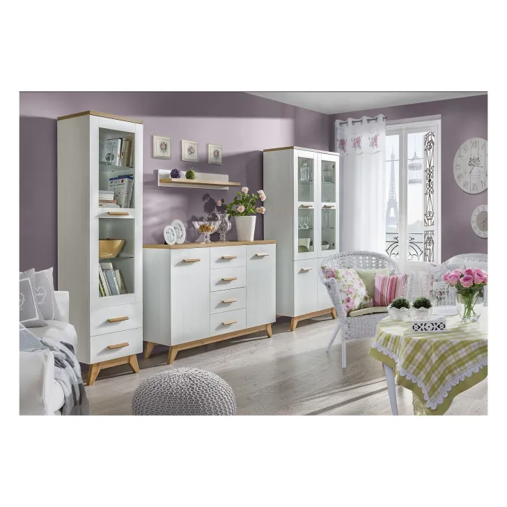 Oferowana komoda została wykonana z najwyższej jakości materiałów, dzięki czemu ma długą żywotność. Jej konstrukcja z płyty laminowanej, krawędzie pokryte obrzeżem ABS oraz tył z płyty HDF gwarantują trwałość i odporność na uszkodzenia. Szuflady zaopatrzone są w kulkowe prowadnice, zapewniające pełen wysuw, przez co korzystanie z nich staje się niezwykle wygodne. Drewniane uchwyty dodają komodzie naturalnego uroku.