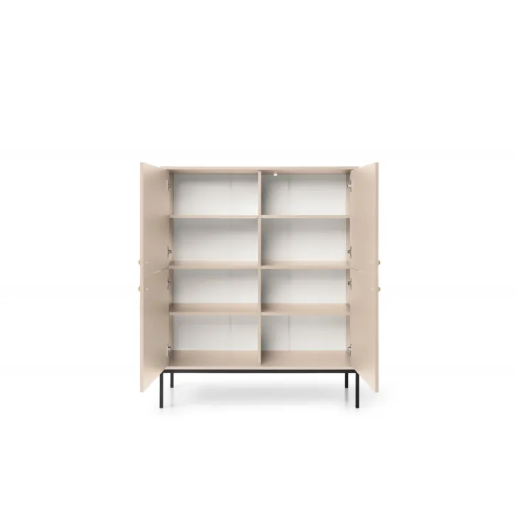 Designerskie uchwyty na drzwiach komody tworzą ciekawe, wielowymiarowe połączenie z kolorystyką mebla, dostępną w wersjach niebieskiej i beżowej. Całość stoi na wysokich, solidnych, metalowych nóżkach, które oprócz stabilizacji mebla, dodają mu lekkości i nowoczesnego charakteru. Wybierając naszą komodę, masz szanse przemienić swoje wnętrze w przestrzeń niczym z okładek najlepszych magazynów wnętrzarskich.