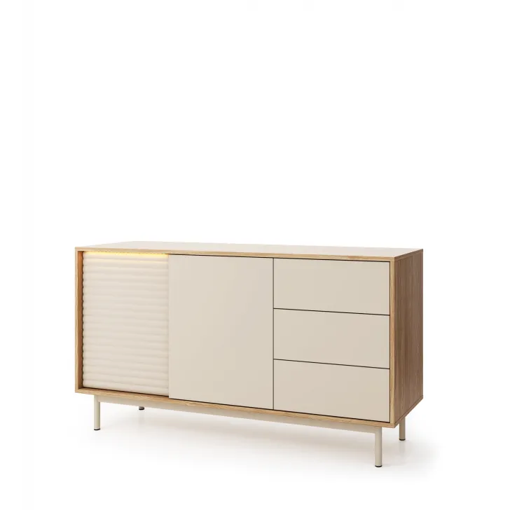 - Wbudowane oświetlenie LED podkreśla frezowany wzór 3D na froncie wykonanym z MDF-u i podkreśla charakter mebla.