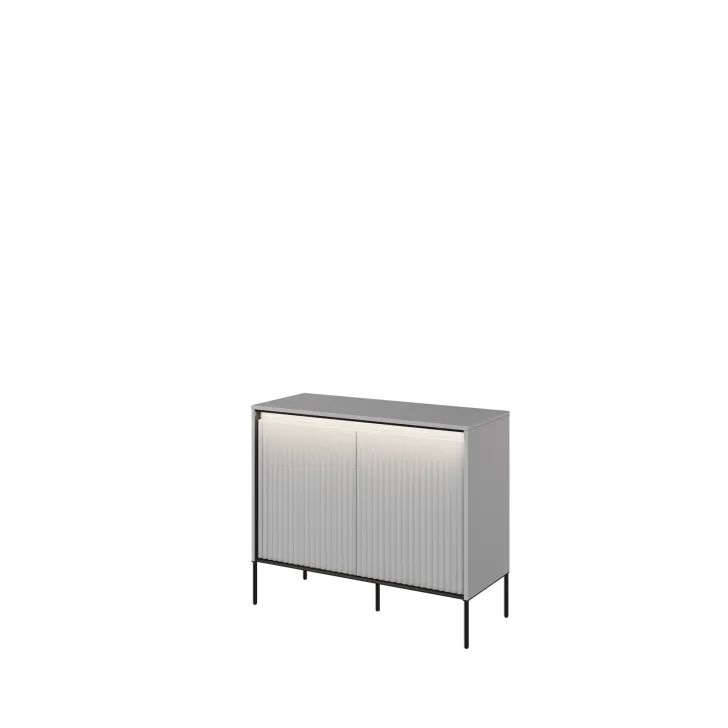 Design komody zwraca uwagę ze względu na kilka szczegółów. Po pierwsze, eleganckie ryflowanie frontów, które idealnie komponuje się z ledowym oświetleniem. Po drugie, blat komody, który może służyć jako idealne miejsce do eksponowania ozdób czy innych dekoracji. Jest to świetne rozwiązanie dla osób, które cenią funkcjonalność połączoną z estetyką.