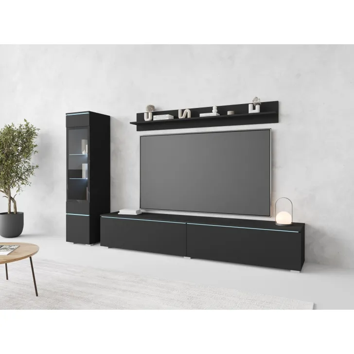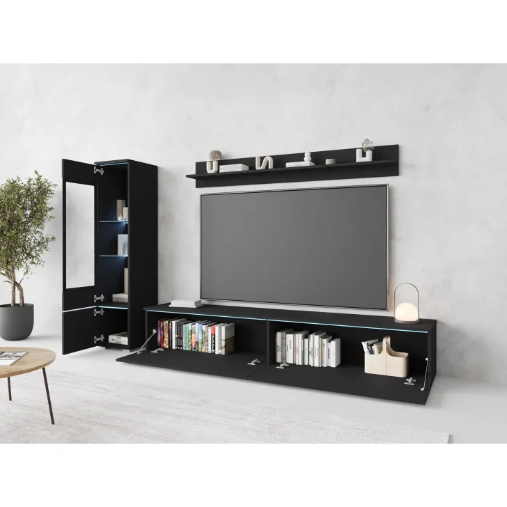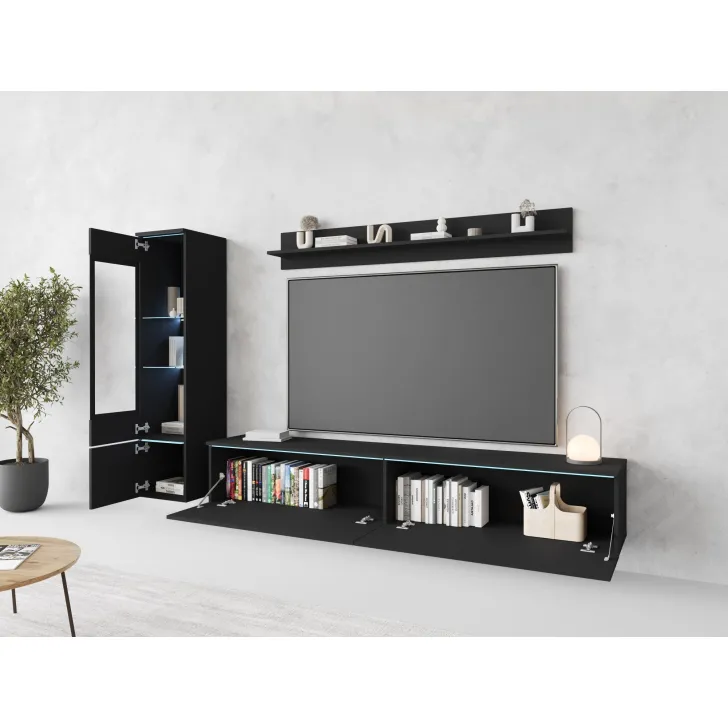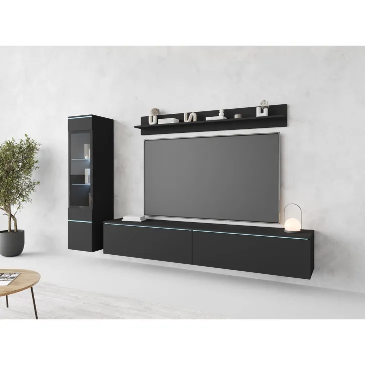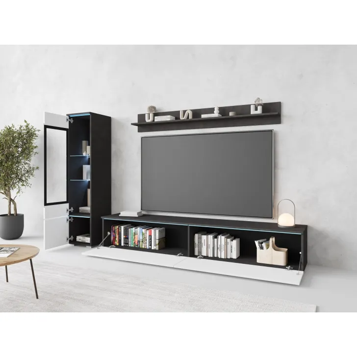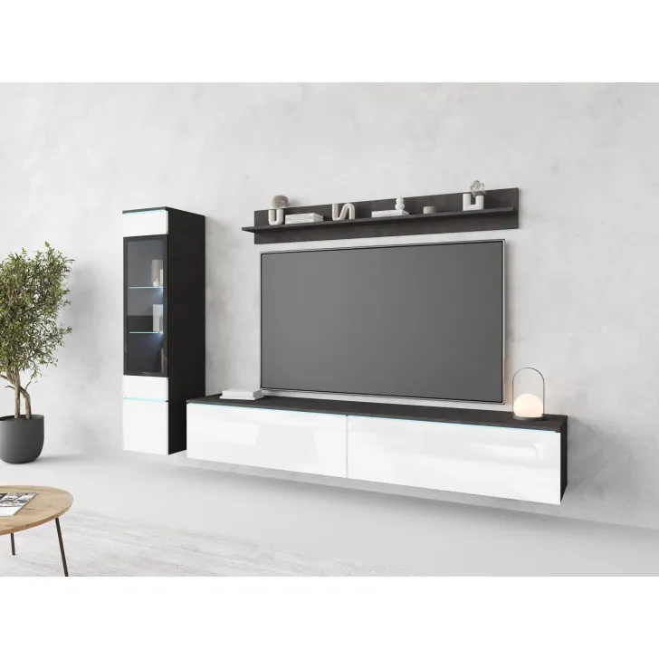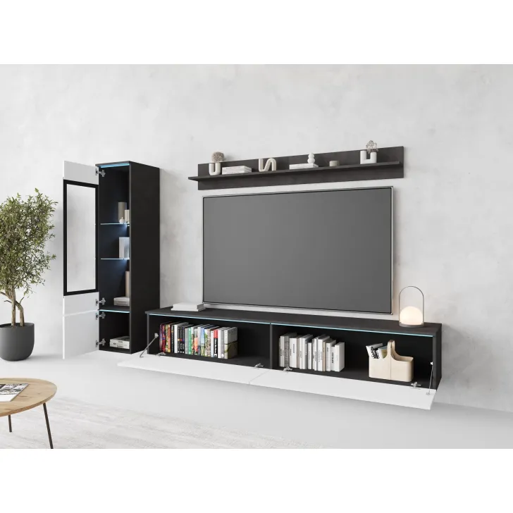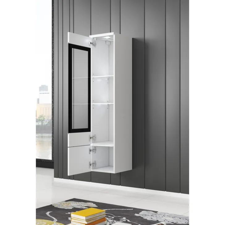 Fronty mebla z płyty polygloss oraz szyba hartowana częściowo malowana stanowią piękne elementy dekoracyjne, nadając meblościance głębi i stylu. Elastyczność montażu pozwala zawiesić meble Veve I na ścianie lub postawić na podłodze. Opcjonalne oświetlenie LED podkreśli design mebla i stworzy przytulną atmosferę w pomieszczeniu.