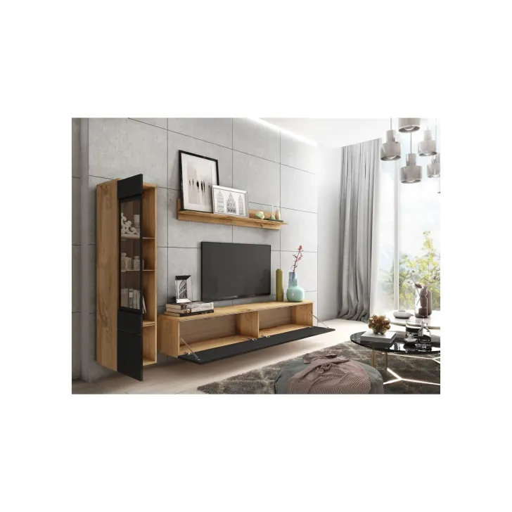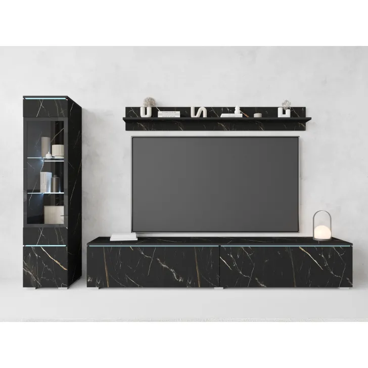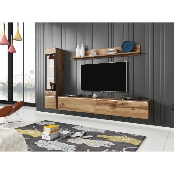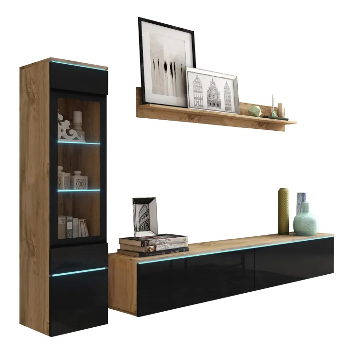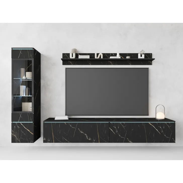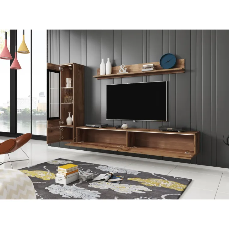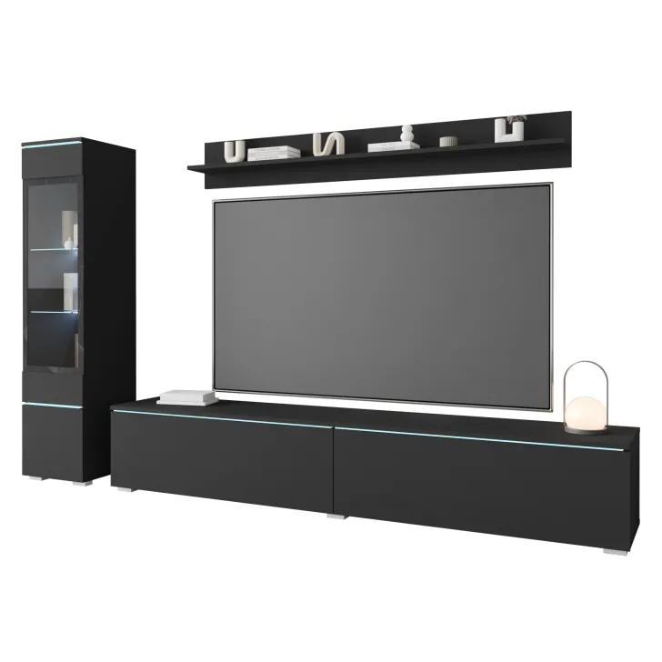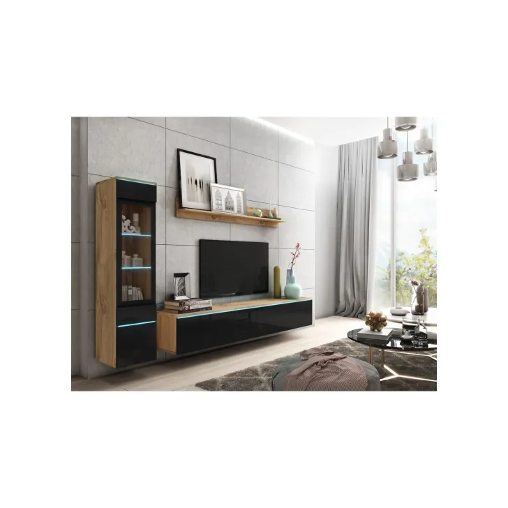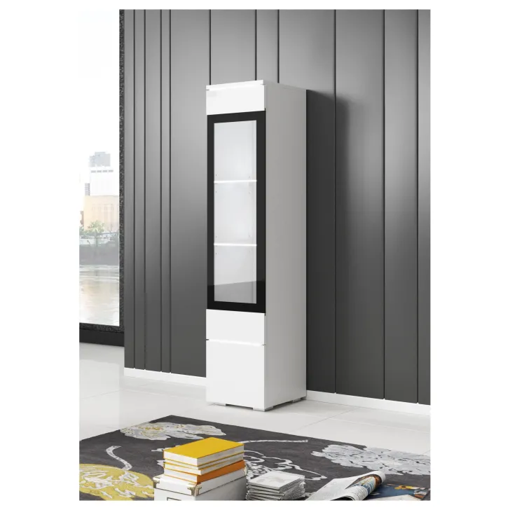 Fronty mebla z płyty polygloss oraz szyba hartowana częściowo malowana stanowią piękne elementy dekoracyjne, nadając meblościance głębi i stylu. Elastyczność montażu pozwala zawiesić meble Veve I na ścianie lub postawić na podłodze. Opcjonalne oświetlenie LED podkreśli design mebla i stworzy przytulną atmosferę w pomieszczeniu.