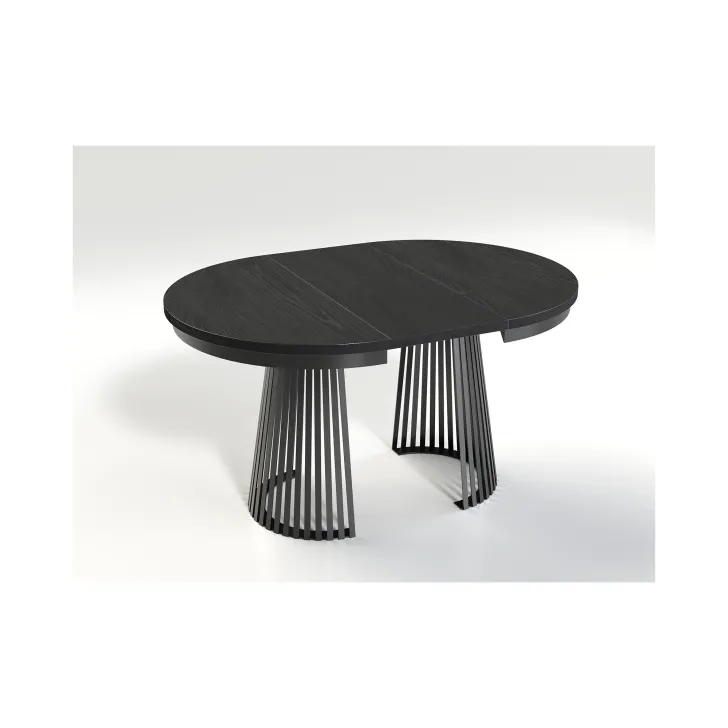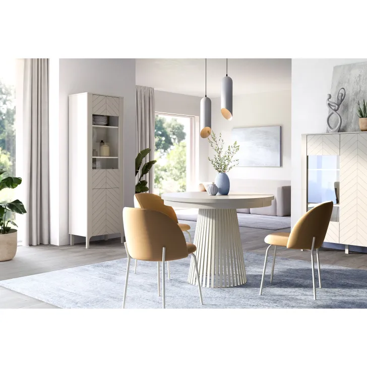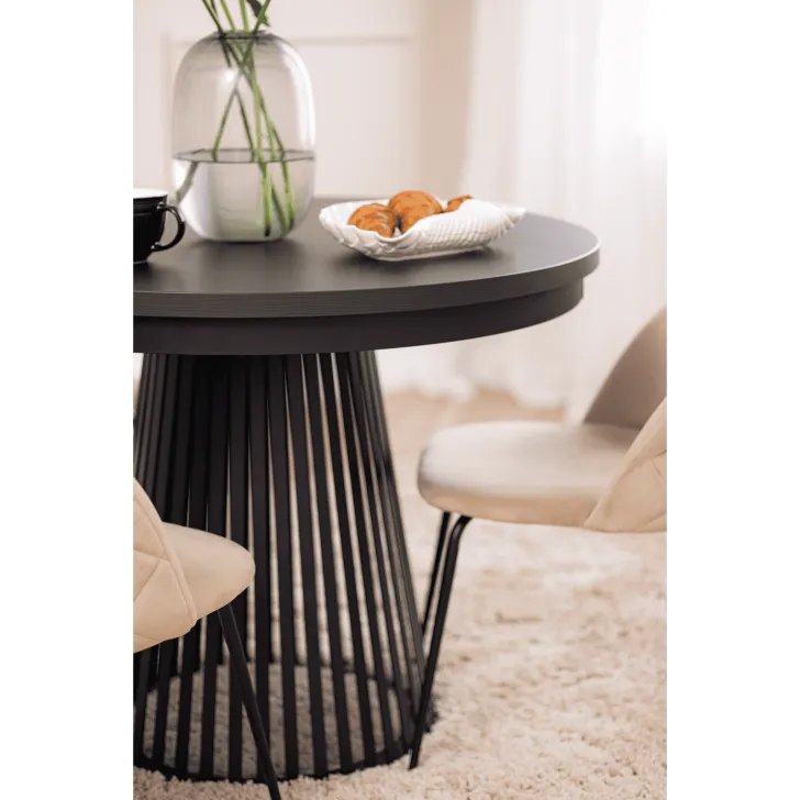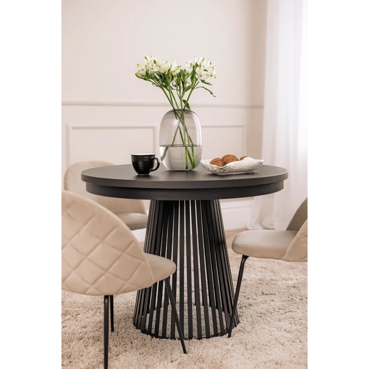 Stół GORI to doskonałe zestawienie eleganckiego wzornictwa i każdodniowej funkcjonalności. To doskonałe dopełnienie dla każdego salonu czy jadalni, stanowiąc ich serce. Charakterystyczny, okrągły blat wsparty na oryginalnej, metalowej podstawie tworzy spójny element, który przyciąga wzrok i doskonale wkomponowuje się w estetykę zarówno nowoczesnych, jak i klasycznych wnętrz.