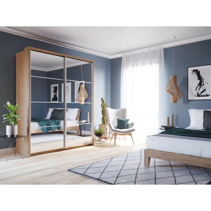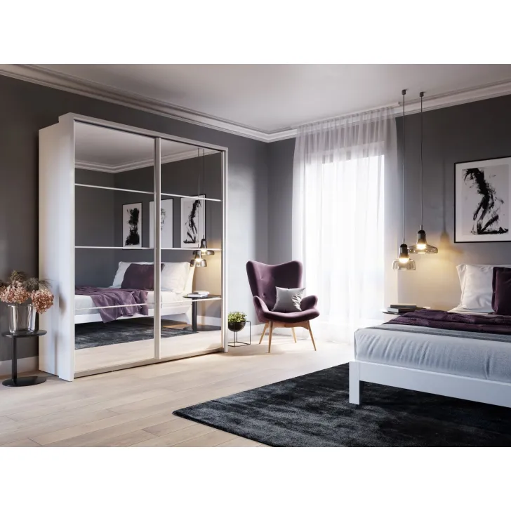 • Dwuskrzydłowe drzwi przesuwne z dużymi lustrami, które optycznie powiększają przestrzeń, a jednocześnie umożliwiają pełne przejrzenie się.
