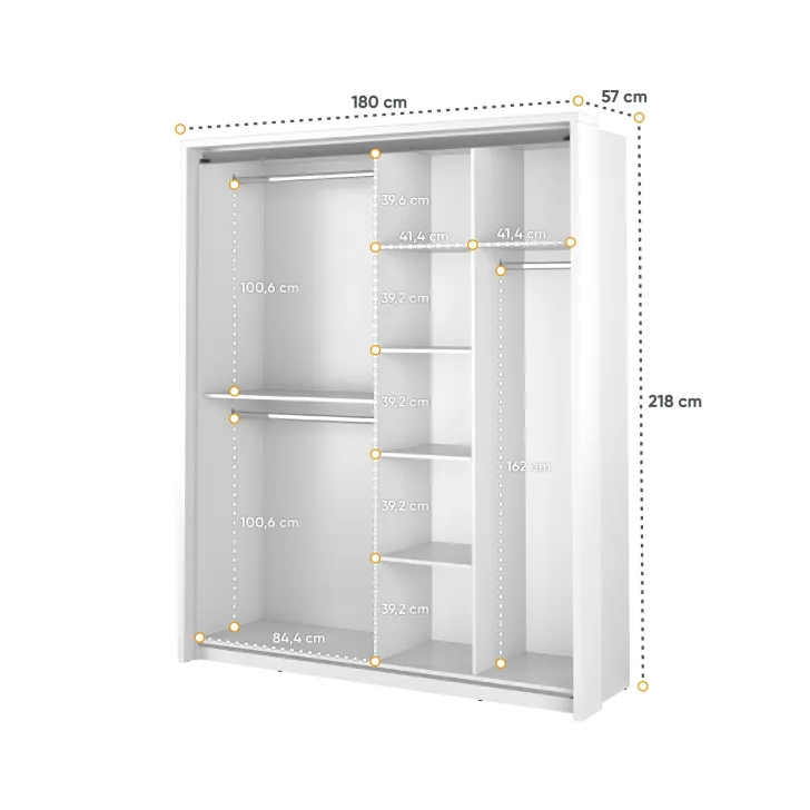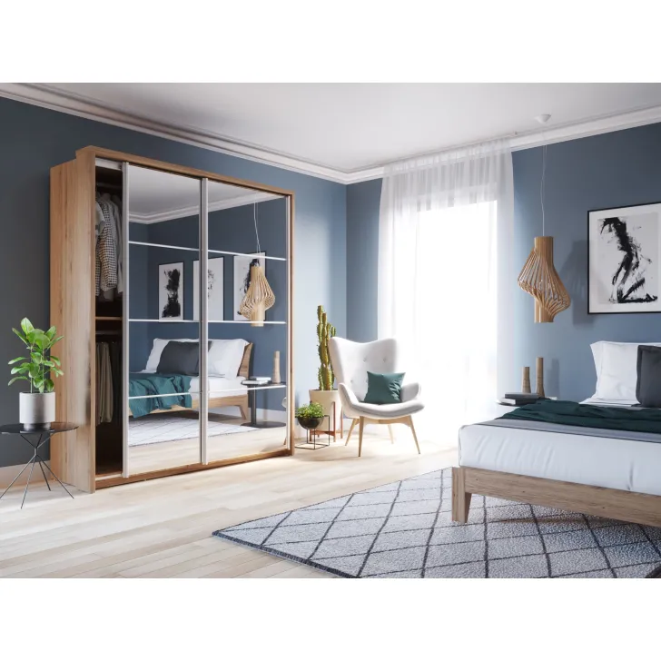 Korzyści z wyboru Szafy ERTA 17 nie kończą się na jej designie. Szafa ta została wykonana z wytrzymałej płyty laminowanej o grubości 16mm, wykończonej trwałym obrzeżem ABS. Posiada też aluminiową prowadnicę frontu szafy (dolny i górny montaż), dwa lustra, trzy metalowe drążki na ubrania oraz kilka przestronnych półek. Szafa ERTA 17 waży 202 kg i ma maksymalne obciążenie półek wynoszące do 5 kg.