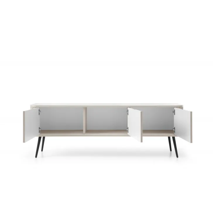 Nie tylko piękna, ale także praktyczna. Szafka RTV ZOYA posiada pojemne wnętrze, przedzielone na trzy części, które skrywają się za solidnymi drzwiami z płyty MDF. To pozwala na łatwy dostęp do przechowywanych przedmiotów i sprzętu RTV.