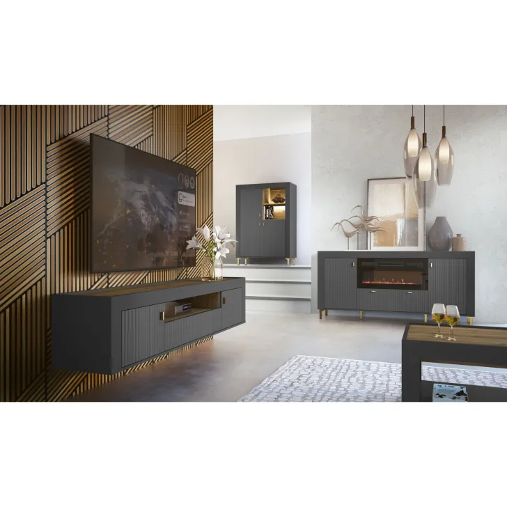 Wprowadź styl, funkcjonalność i elegancję do swojego wnętrza z nowoczesną i przestronną szafką RTV "ASSO 8". Dzięki atrakcyjnym i eleganckim frontom, ta szafka pod telewizor będzie wyglądać olśniewająco zarówno w salonie, sypialni, jak i biurze. Za drzwiami z ciekawymi wzorami możesz przechowywać wszystko, co chcesz ukryć przed ciekawskimi spojrzeniami, jednocześnie oferując szeroki blat i otwarte półki, które umożliwiają wyeksponowanie twoich ulubionych przedmiotów.