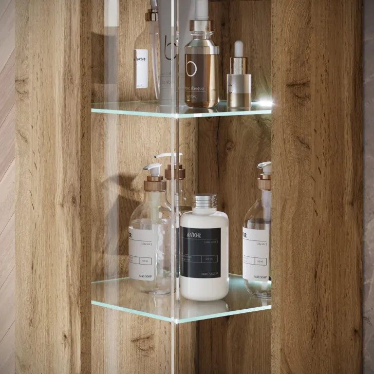 Zestaw składa się z dwóch wiszących szafek, które nie tylko zapewniają miejsce na przechowywanie, ale także umożliwiają eksponowanie ulubionych kosmetyków za szklanymi drzwiami. Dodatkowo, panel z lustrem pozwala na wygodne codzienne użytkowanie, a półka dodatkowo zwiększa funkcjonalność.